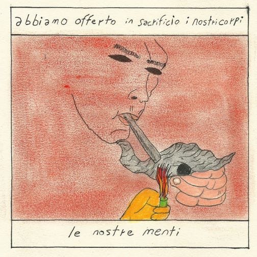 Probabilmente è riduttivo rinchiudere nell’ambito della ‘drogologia’ questo trittico sulle cerimonie quotidiane di auto-sacrificio. Tuttavia, grazie alla luce oscura che emana, master of ceremonies permette di scorgere per difetto la forma in cui si sta cristallizzando un certo dibattito sulle droghe in Italia, nell’era del rinascimento psichedelico. A differenza di quest’ultimo, non c’è alcun tentativo di normalizzarsi come oratorio chimicamente impreziosito, non c’è la volontà di brandizzarsi attraverso la cura (in senso politico o farmaceutico), non c’è alcuna intenzione di vendere qualcosa ai ‘turisti’ di esperienze cool & edgy. C’è solo questa gigantesco forza distruttrice che ti toglie qualsiasi energie, ti sconfigge quotidianamente; e nonostante questo irradia bellezza e senso su quel poco che hai ancora attorno.
